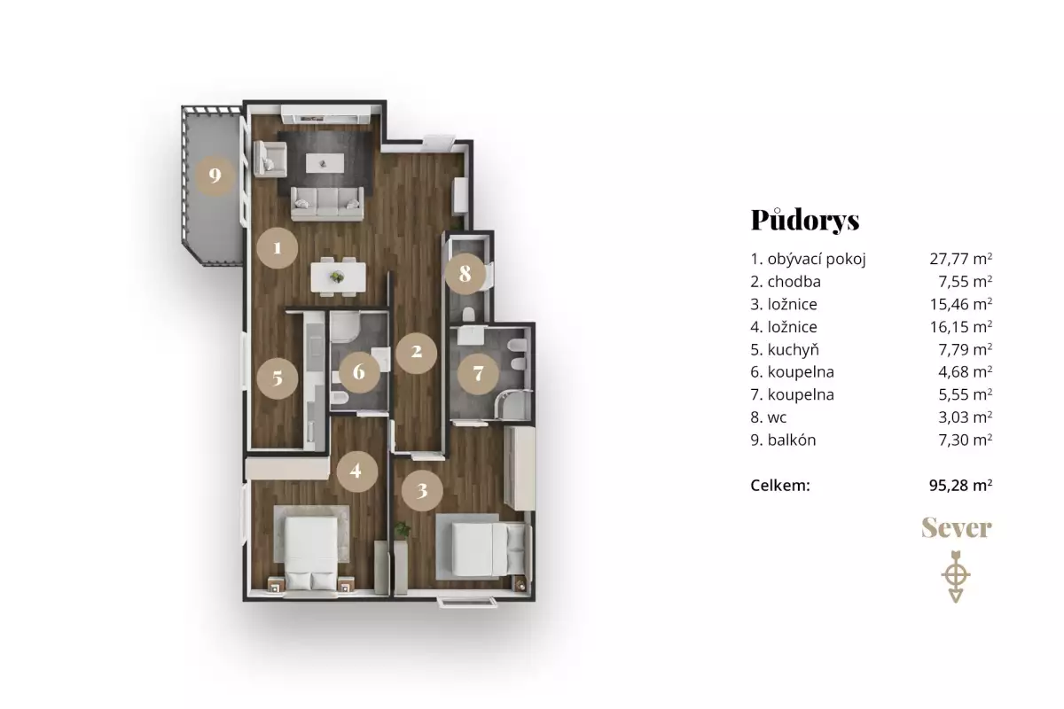 الطابق الثالث - الشقة رقم 203 ? 111,35 m² شقة 3 غرف + مطبخ + لوجيا 6 334 230 Kč Open