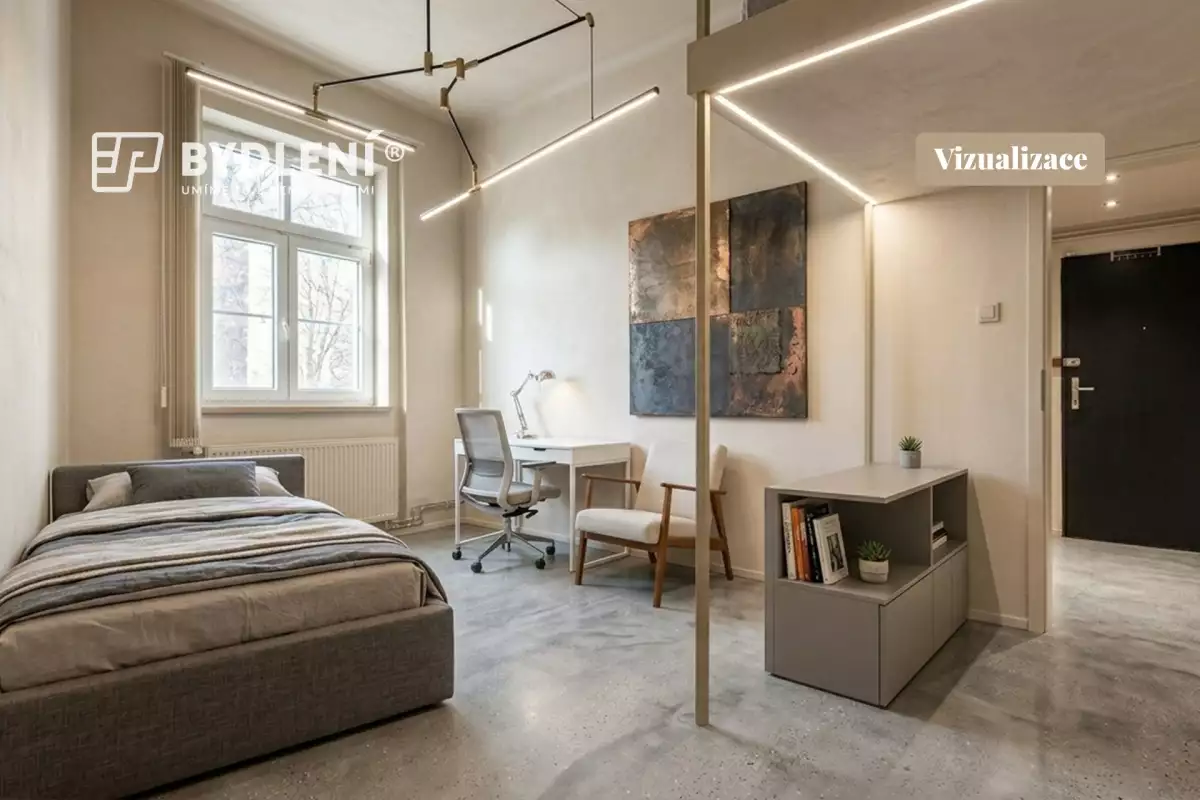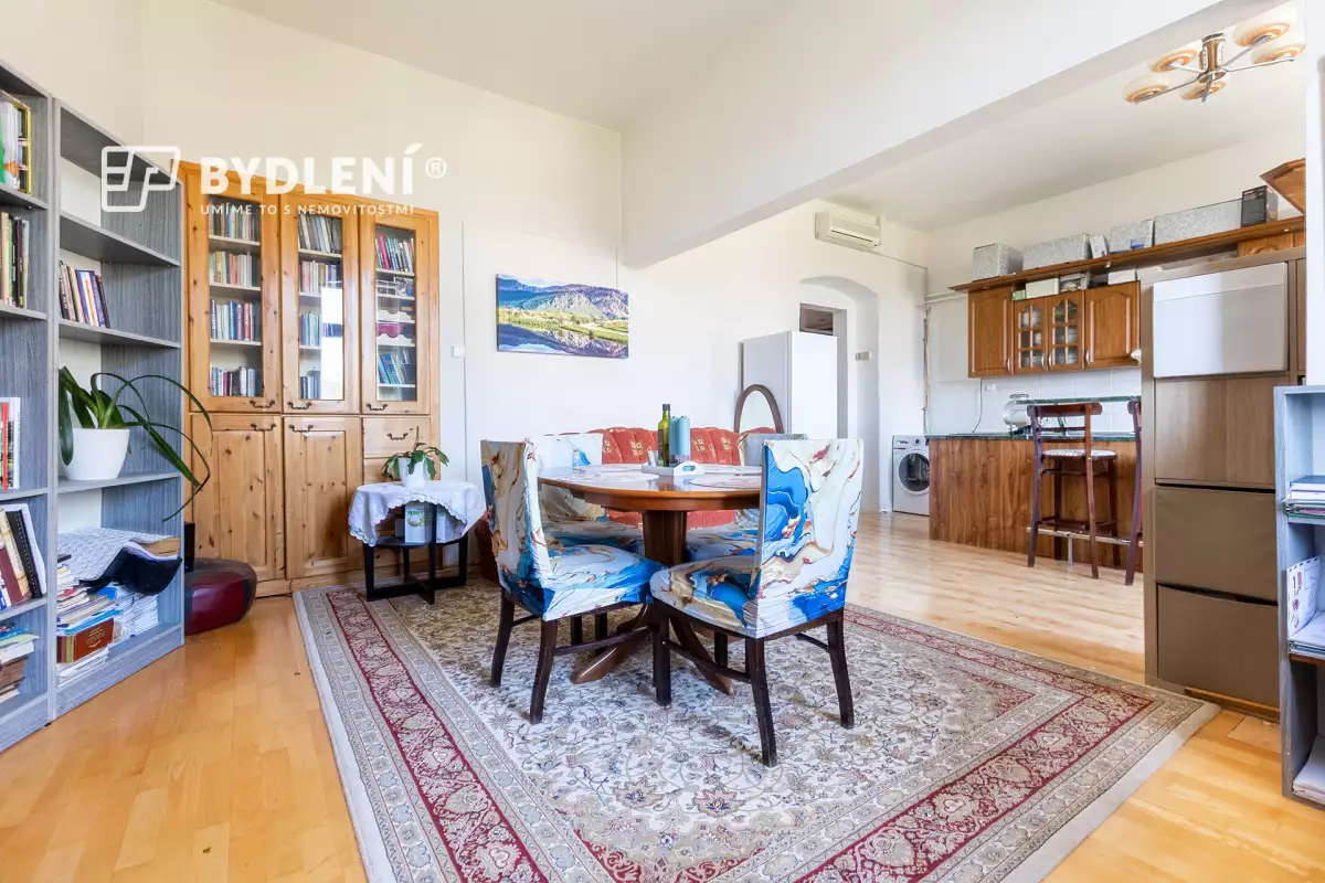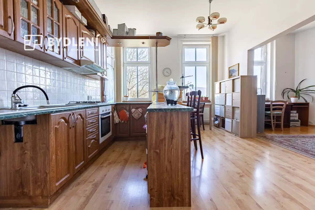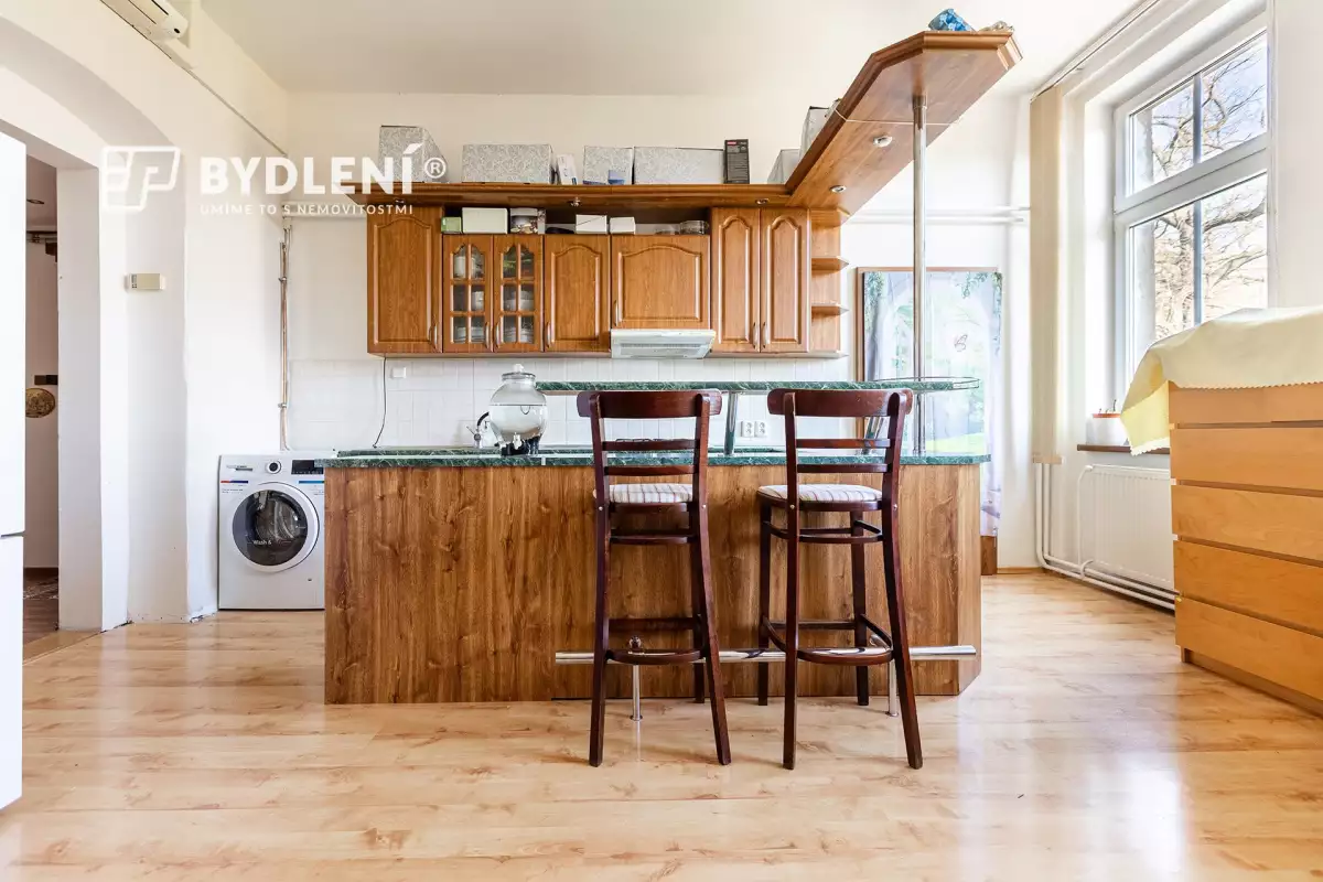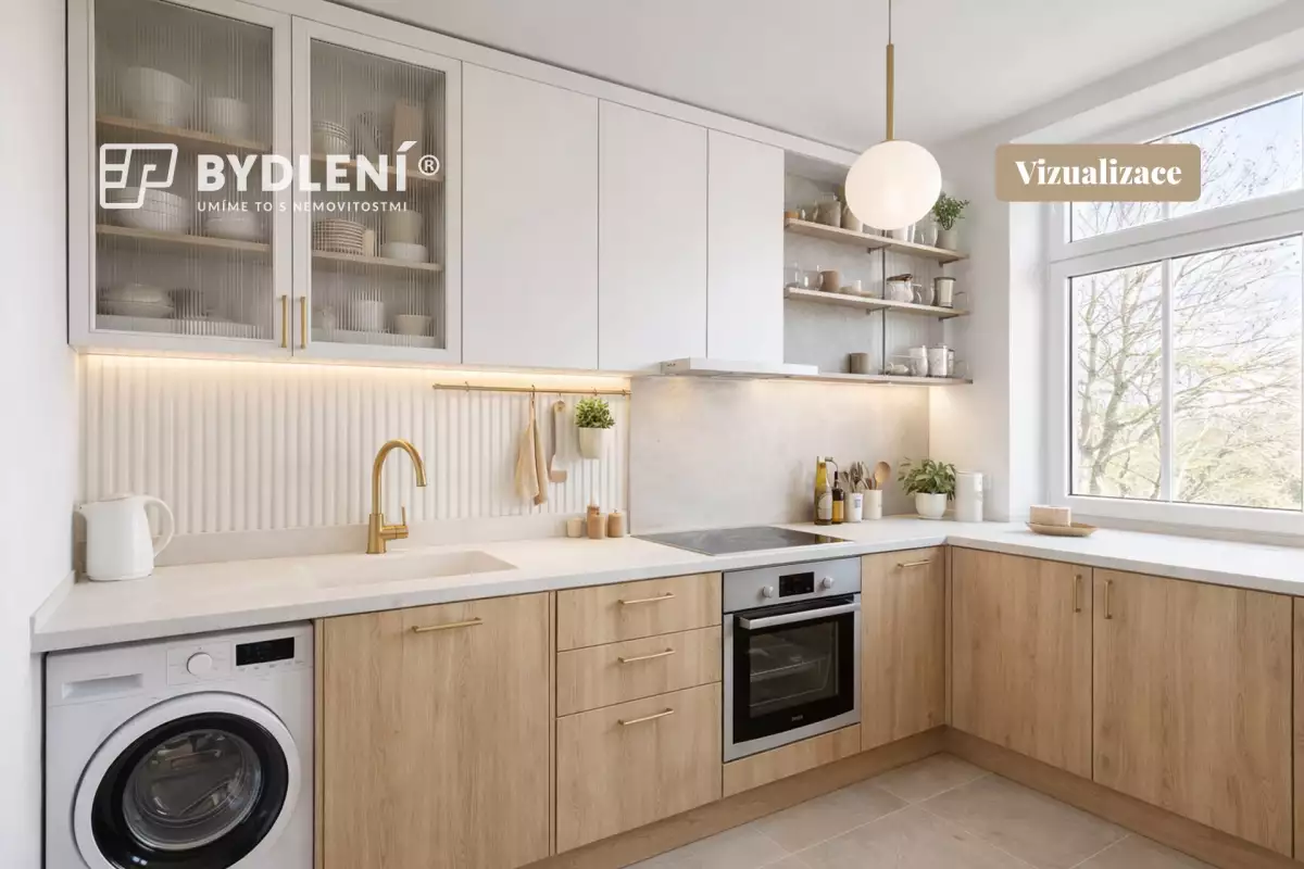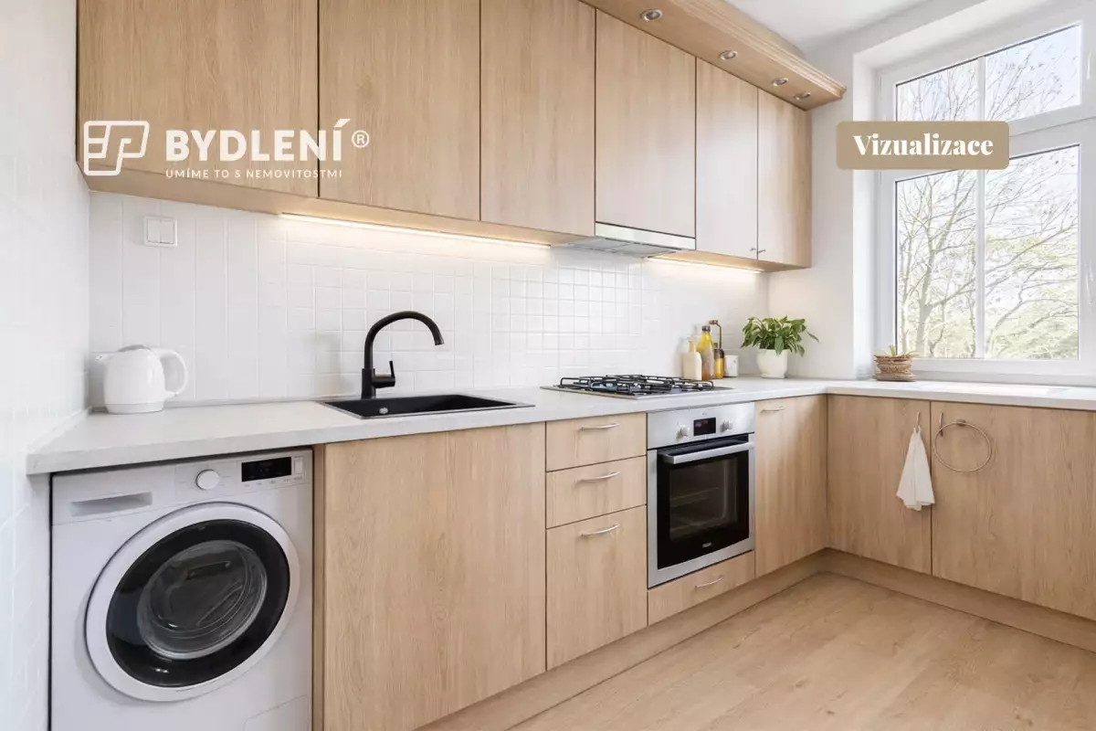 Současné uspořádání bytu však odpovídá spíše dispozici 3kk – kuchyň je totiž z velké části propojena s obytným prostorem, což vytváří vzdušný a otevřený celek odpovídající dnešním nárokům na bydlení. Přidanou hodnotou je výhled do zeleně v protějším parku.