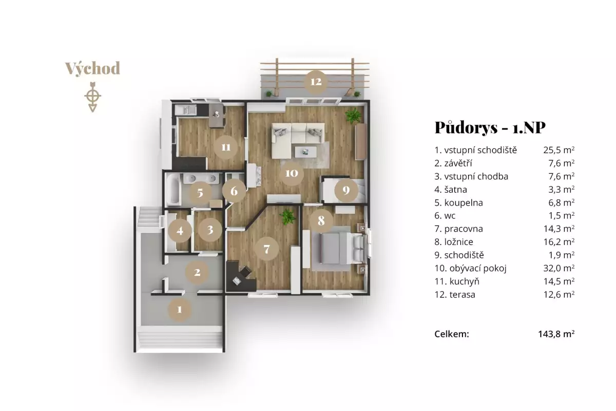 | 1.NP - přízemí | 143,8 m² | |