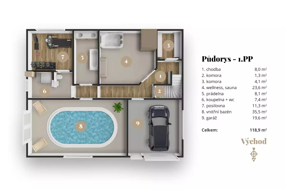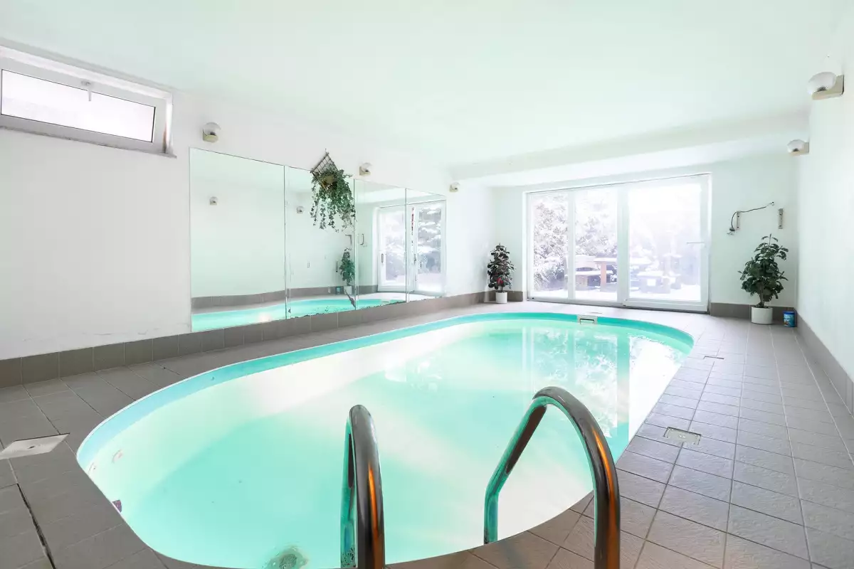 Jednou z nejvýraznějších předností domu je suterénní podlaží, které slouží jako plnohodnotná wellness zóna. Nachází se zde vnitřní bazén a sauna, tedy prvky, které výrazně zvyšují komfort bydlení a umožňují relaxaci přímo v rámci domu, bez nutnosti dalšího dojíždění nebo externích služeb.