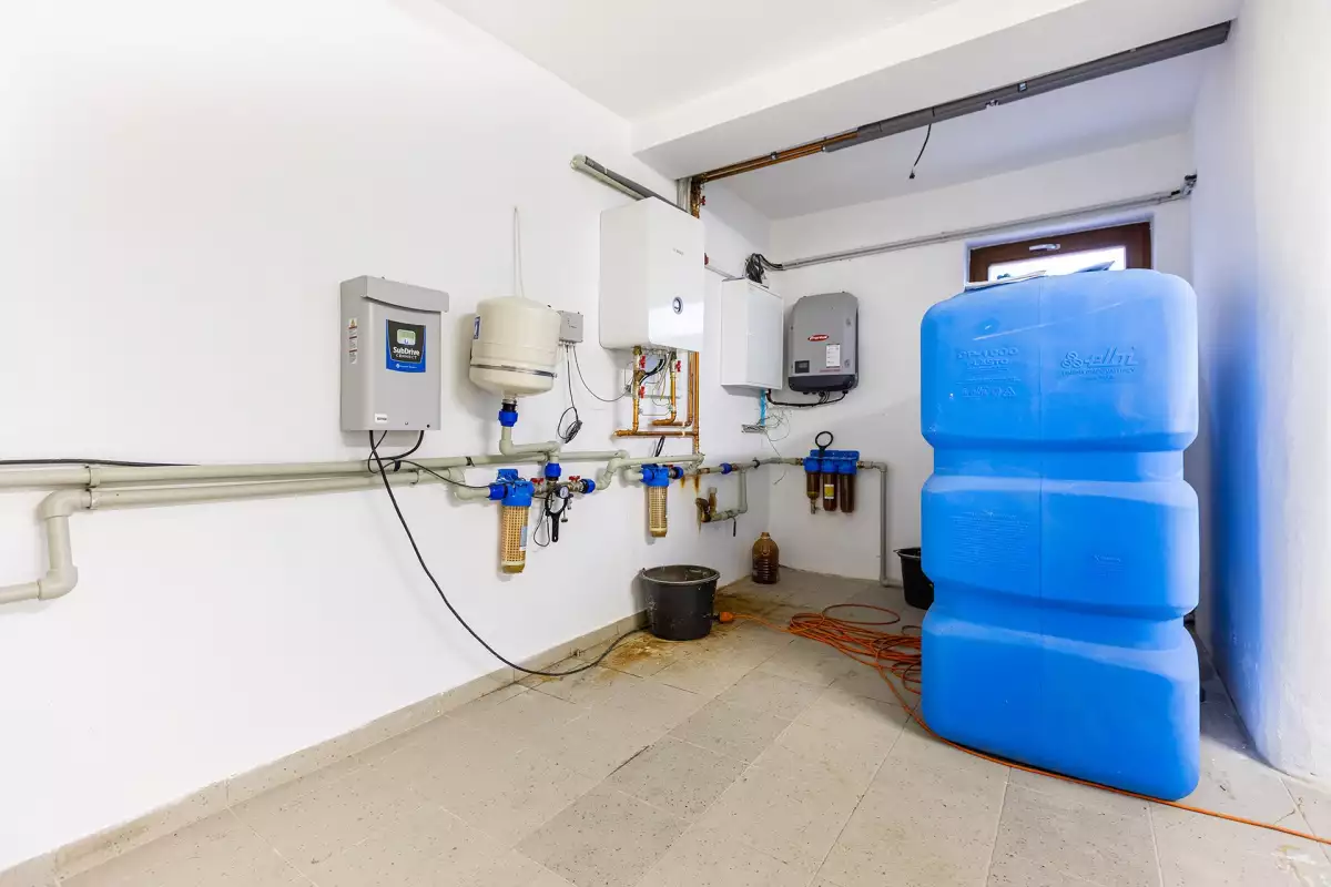 Technické zázemí domu je soustředěno v suterénu a zahrnuje dvougaráž s napojením na vodu, elektřinu (včetně 380 V) a manipulační techniku. Dále jsou zde umístěny technologické prvky pro řízení provozu domu, včetně měničů napětí, rozvaděčů a systémů pro přepínání vodních zdrojů a napojení fotovoltaiky. Rozvody jsou řešeny s ohledem na oddělení jednotlivých částí objektu.