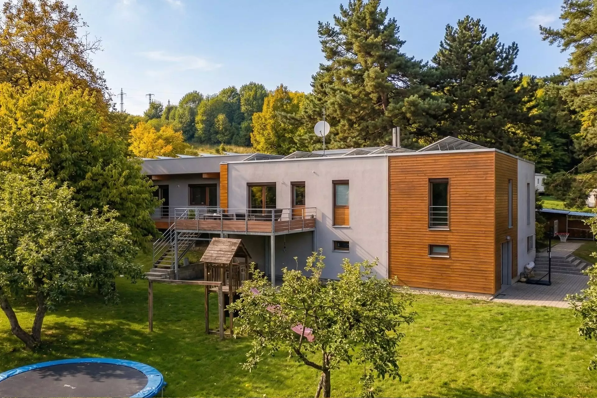 FotogalerieTento dům je navržen jako energeticky nezávislý uzel. Vlastní fotovoltaická elektrárna (9 kW) v kombinaci s hlubinným vrtem a dvěma studnami zajišťuje minimální závislost na veřejných sítích. Špičková hliníková okna s izolačními trojskly, zónové podlahové vytápění a klimatizace v každém pokoji nové části garantují dokonalý akustický a tepelný standard. Suterén domu ukrývá nejen garáž pro dvě auta, ale i další 4 místnosti připravené pro vaše fitness, dílnu s manipulačním jeřábem nebo rozsáhlé úložné prostory.